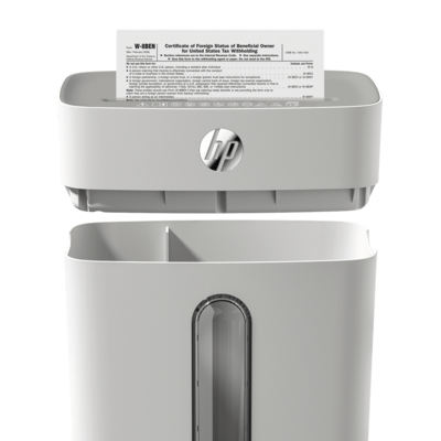 The handy document shredder HP OneShred 8CC respectivley OneShred 8CC Black in modern design is a quintessential feature of any household and fits next to every desk. Thanks to the high security level P-4, the DSGVO-compliant shredding of sensitive data such as salary slips and tax returns is guaranteed. Up to eight DIN A4 sheets can be shredded at the same time in particle cut via the intuitive operation. Even paper clips, staples and credit cards are no problem for this reliable shredder. The shredder has an automatic reverse function in the event of a paper jam, as well as an overheating and overload indicator. Thanks to the viewing window, you are always alerted when the box needs to be emptied, even without a technical fill level indicator for the waste bin.