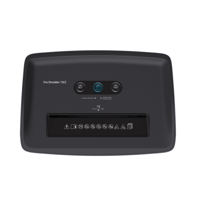 The elegant HP Pro Shredder 15CC in black design fits next to any desk and should not be missing in any office. With a shredding capacity of 15 A4 sheets, the document shredder shreds your sensitive company data in cross cut into 4 mm x 35 mm clippings and thus meets the high requirements of security level P-4. This ensures the destruction of personal documents such as employment contracts or payrolls in accordance with the data protection directive. The convenient shredder with lockable rollers scores points compared to the similar device from the OneShred series with a particularly quiet operating noise of only 55 decibels and a longer operating time of 20 minutes.